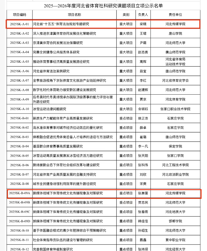 近日,2025-2026年度河北省体育社会科学研究课题项目立项结果正式公布,我院青年教师张晨蕾主持申报的课题“新媒体视域下体育传统文化传播现象及对策研究”成功获得重点项目立项(课题号2025SK-B-09A),实现了我院乃至我校在该项课题申报工作中的重大突破。