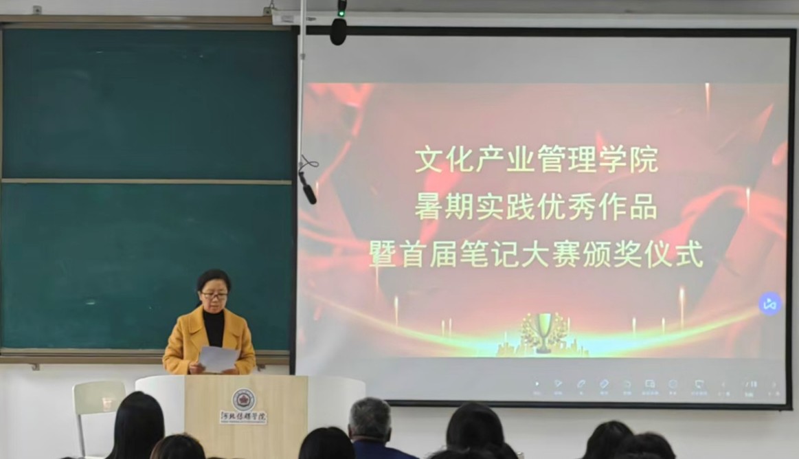 2025年10月31日,文化产业管理学院暑期实践优秀作品暨首届笔记大赛颁奖仪式在AB101隆重举办。数字商务教研室主任李晶主持仪式,院长郭会斌、副院长宋菲、会展管理教研室主任鲍晓宁及全体师生代表齐聚现场,共同为优秀学子喝彩。