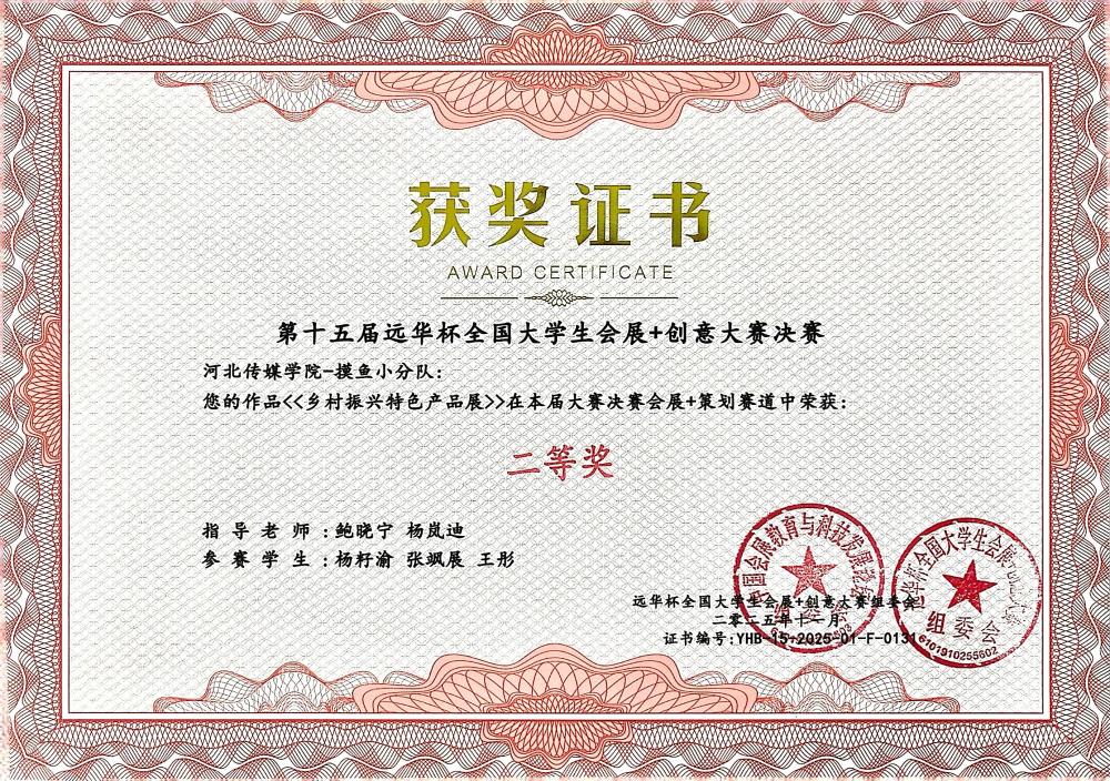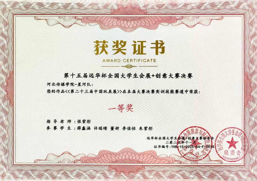 11月7日至9日,第十五届“远华杯”全国大学生会展+创意大赛决赛在广州清远成功举办。作为全国会展专业领域极具影响力的赛事,本届大赛吸引了来自全国87所高校的464支队伍同台竞技,并最终筛选出113支队伍晋级决赛。我校学生凭借出色的综合表现在决赛中斩获多项荣誉:河北传媒学院获教学成果一等奖,“新星之火队”《首届河北文化旅游博览会》、“星河队”《第二十三届中国玩具展》摘得一等奖,其余队伍斩获二等奖5项。