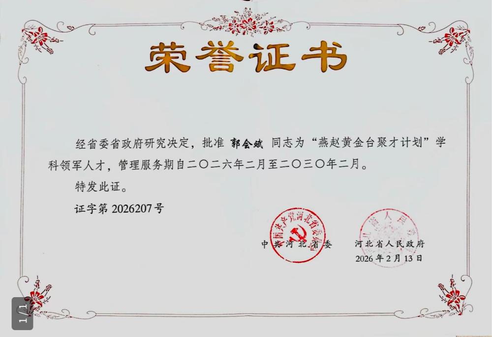 近日,中共河北省委、河北省人民政府正式公布“燕赵黄金台聚才计划”学科领军人才入选名单,我院院长郭会斌教授凭借深厚的学术造诣、突出的科研建树、卓越的育人成效及行业影响力,成功跻身入选。这是对郭会斌教授个人学术能力与贡献的高度肯定,更是我院学科建设与人才队伍建设的重大突破,为学院高质量发展注入强劲动力。
