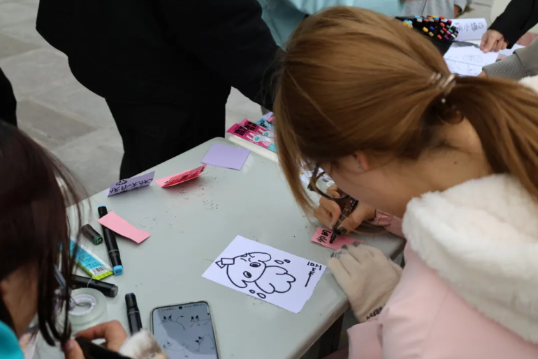 随着气温降低,流浪猫狗生存难度加大。活动以“为校园流浪猫创设IP、评选团宠”为核心,同步普及流浪猫保护与科学喂养知识,让专业实践与爱心守护双向发力。活动现场由学生分为四个小组协同运作,互动区域人气高涨。IP创设画像组聚焦“为流浪猫造IP”,不少参与观众到场便惊喜表示“认识它!”凭借熟悉的记忆加上对现场照片仔细观察,用画笔为它们设计专属形象与IP名称,助力猫咪“出圈”。