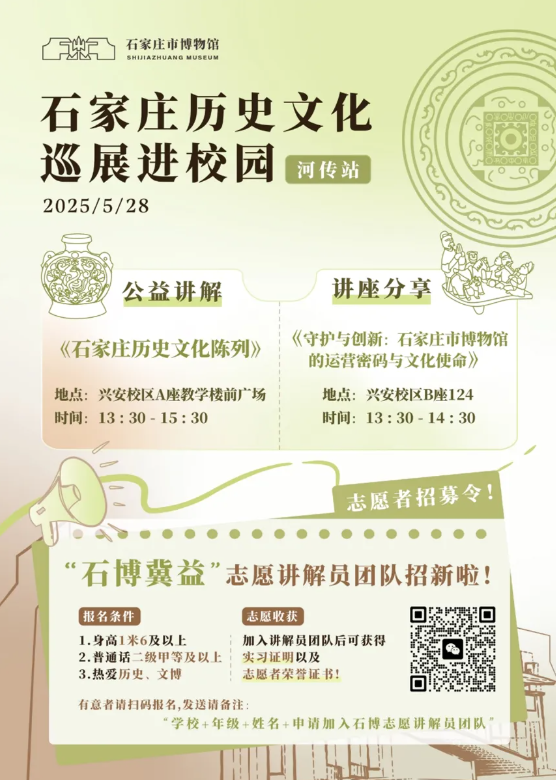 为深化校馆合作,推动博物馆资源与高校教育深度融合,5月28日,河北传媒学院文化产业管理学院与石家庄市博物馆联合举办的“石家庄历史文化巡展进校园”活动在兴安校区举行。本次活动是文化产业管理专业课程《博物馆经营与管理》的实践延伸,旨在通过展览、讲座及志愿者招募等形式,让学生近距离感受历史文化魅力,同时为博物馆事业注入新生力量。