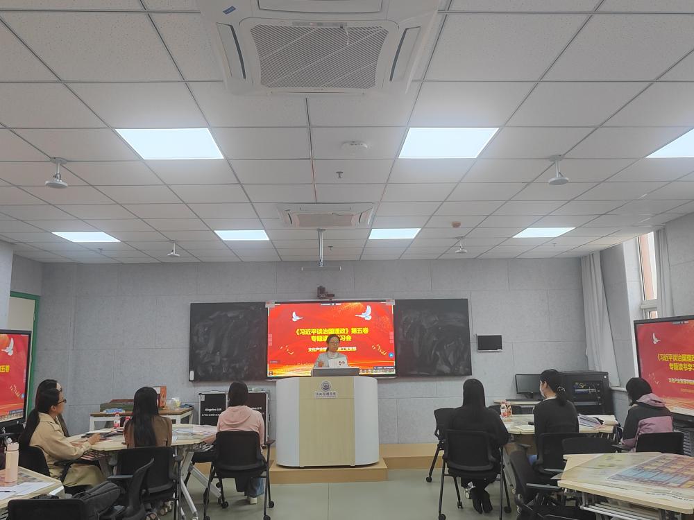 2025年10月17日河北传媒学院文化产业管理学院教工党支部积极响应上级党组织号召,于新闻楼414组织全体教职工深入开展《习近平谈治国理政》第五卷专题学习活动。本次学习会由教师党支部书记李晶老师主持,旨在深刻把握著作中的核心要义、精神实质与实践要求,将其作为坚持社会主义办学方向、落实“立德树人”根本任务的强大思想武器和行动指南,切实将学习成效转化为推动学院各项事业发展的不竭动力。