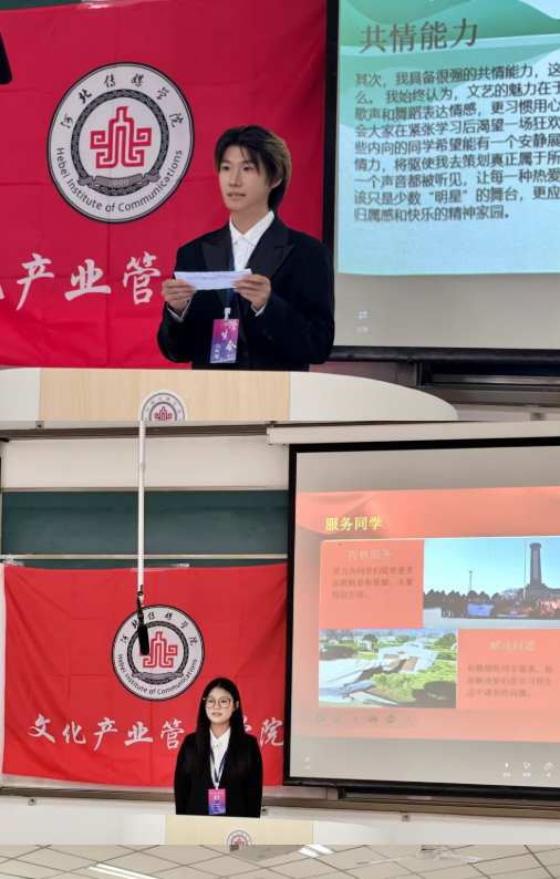 作为连接学院与学生的纽带,学生会部门负责人是组织运转的核心力量。竞选环节中,候选人依序登台,从个人特质、能力优势出发,结合对部门工作的思考,清晰阐述未来工作规划,字里行间尽显对服务集体的热忱与对竞选的重视。