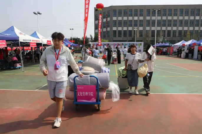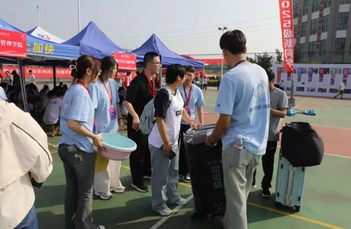 篮球场上的迎新站点,成了当天最热闹的“暖心枢纽”。文管学院的帐篷下,学长学姐们分工明确: